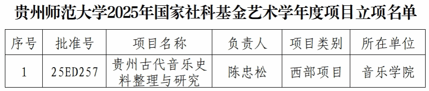 近日,文化和旅游部科技教育司、全国艺术科学规划领导小组办公室正式公布2025年度国家社科基金艺术学项目立项名单。本年度国家社科基金艺术学项目共立项258项,贵州省获批2项,其中我校获批1项。