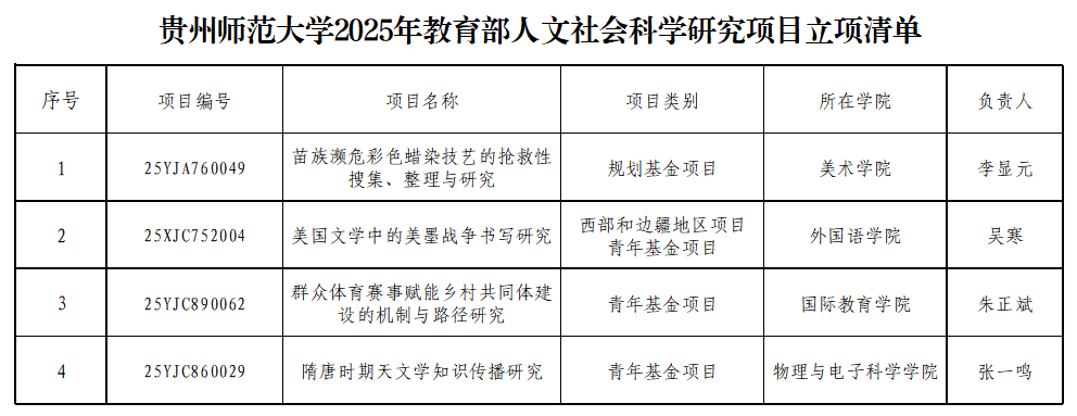 近日,教育部社科司公布了2025年度教育部人文社会科学研究一般项目立项名单,我校获批4项(规划基金项目1项、青年基金项目2项、西部和边疆地区项目1项),立项数位列贵州省第一,涉及体育科学、新闻学与传播学、艺术学、外国文学等多个学科领域。