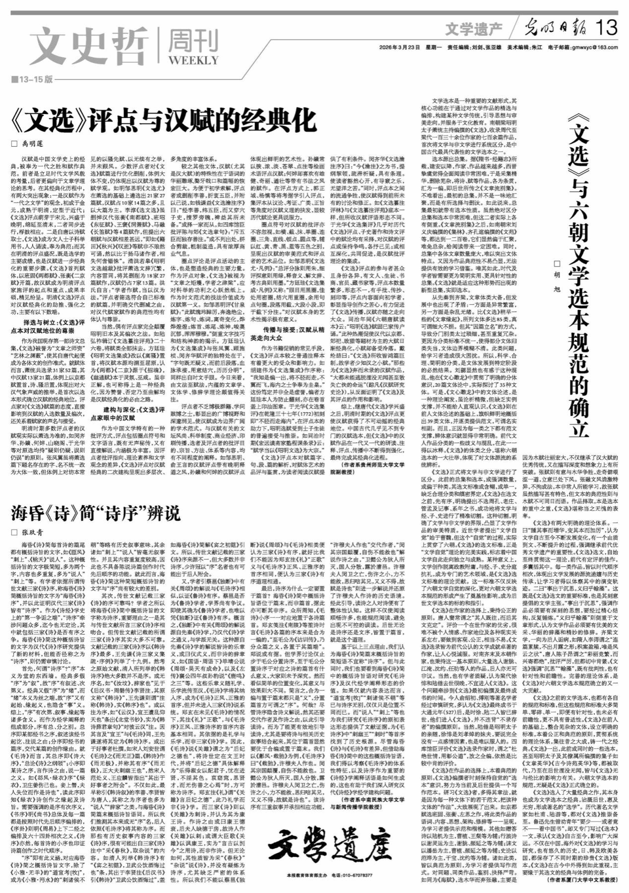 3月23日,我校文学院副教授禹明莲在《光明日报》文学遗产版发表理论文章《<文选>评点与汉赋的经典化》。