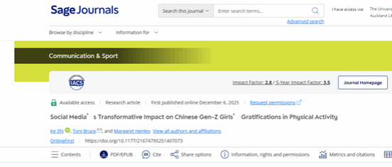 近日,我校体育学院教师石珂在体育传播领域国际期刊《Communication & Sport》在线发表题为“Social Media’s Transformative Impact on Chinese Gen-Z Girls’ Gratifications in Physical Activity”的学术论文。该期刊为SSCI收录期刊(中科院一区TOP),在体育传播与体育社会学研究领域具有较高国际学术影响力。