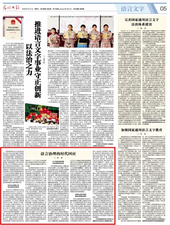 文章聚焦新修订的国家通用语言文字法,围绕新时代语言治理面临的新形势新任务,系统阐释了国家通用语言文字法治建设的时代背景、制度价值和实践要求。文章指出,国家通用语言文字法施行20多年来首次系统性完善,是贯彻落实习近平法治思想在语言文字领域的生动体现。修订后的法律在宪法统领下,与民族团结进步促进法以及教育法、学前教育法等相关法律协同衔接,进一步夯实了国家通用语言文字社会应用的法治基础,更好发挥国家通用语言文字在铸牢中华民族共同体意识、坚定文化自信、提升国家治理效能等方面的重要作用。